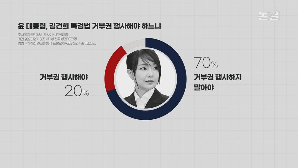 최근 실시된 여론 조사에 따르면, 국민의 70% 이상이 윤 대통령이 김건희 특검법에 대해 거부권을 행사하는 것에 반대하고 있습니다. 이는 대통령의 결정을 둘러싼 국민의 의견이 우려스러움을 나타내고 있음을 보여줍니다.