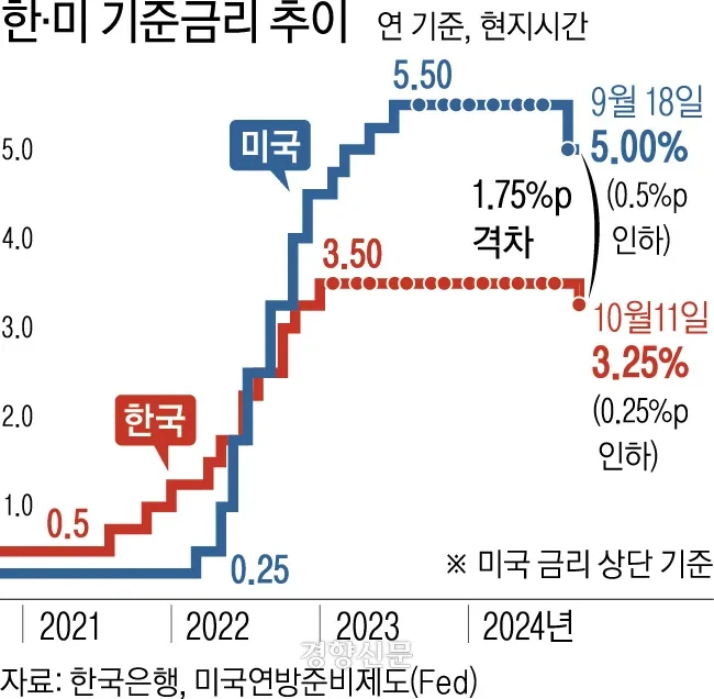 에서 볼 수 있듯이, 한국과 미국의 금리 변화 추세는 서로 다른 방향으로 나아가고 있어요.