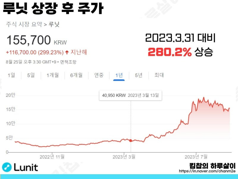 최근 1년 동안 주가는 299.23% 상승하였으며, 이 중에서도 특히 2023년 3월 31일 이후 280.2%의 증가가 눈에 띕니다. 이러한 주가 상승은 루닛의 기술력과 시장의 기대감에 크게 기인하고 있습니다.