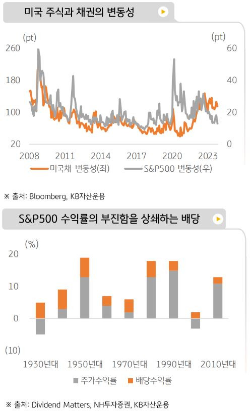 미국 주식과 채권 시장의 변동성을 비교한 그래프입니다. S&P 500의 변동성이 두드러지네요.