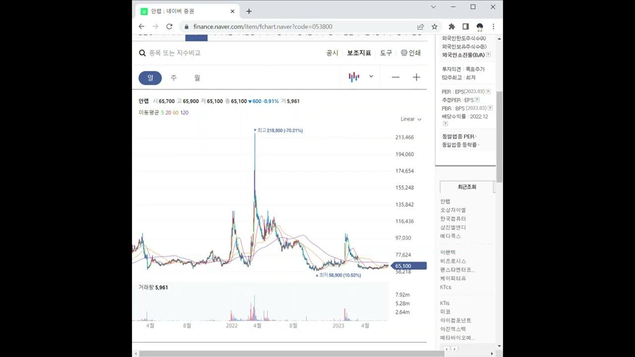 안랩의 주가는 최근 몇 년간 큰 변동성을 보였어요. 2023년 초에는 주가가 60,000원대에서 시작해, 3개월 동안 상승세를 보이며 140,000원에 도달했어요. 하지만 이후 다시 하락세로 돌아서 현재는 69,800원에 거래되고 있죠. 주가 차트를 살펴보면, 최근 3개월 동안의 주가 흐름이 뚜렷하게 나타나고 있어요.