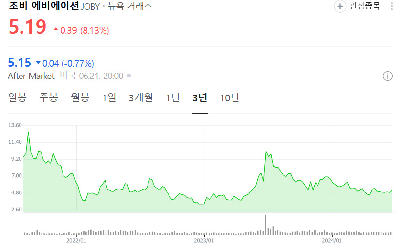 조비 에비에이션의 주가는 최근 몇 년간 큰 변동성을 보였어요. 현재 주가는 5.19달러로, 최근 8.13% 상승했어요. 주가 차트를 살펴보면, 2021년 초부터 2023년 중반까지의 주가 변동을 확인할 수 있어요.