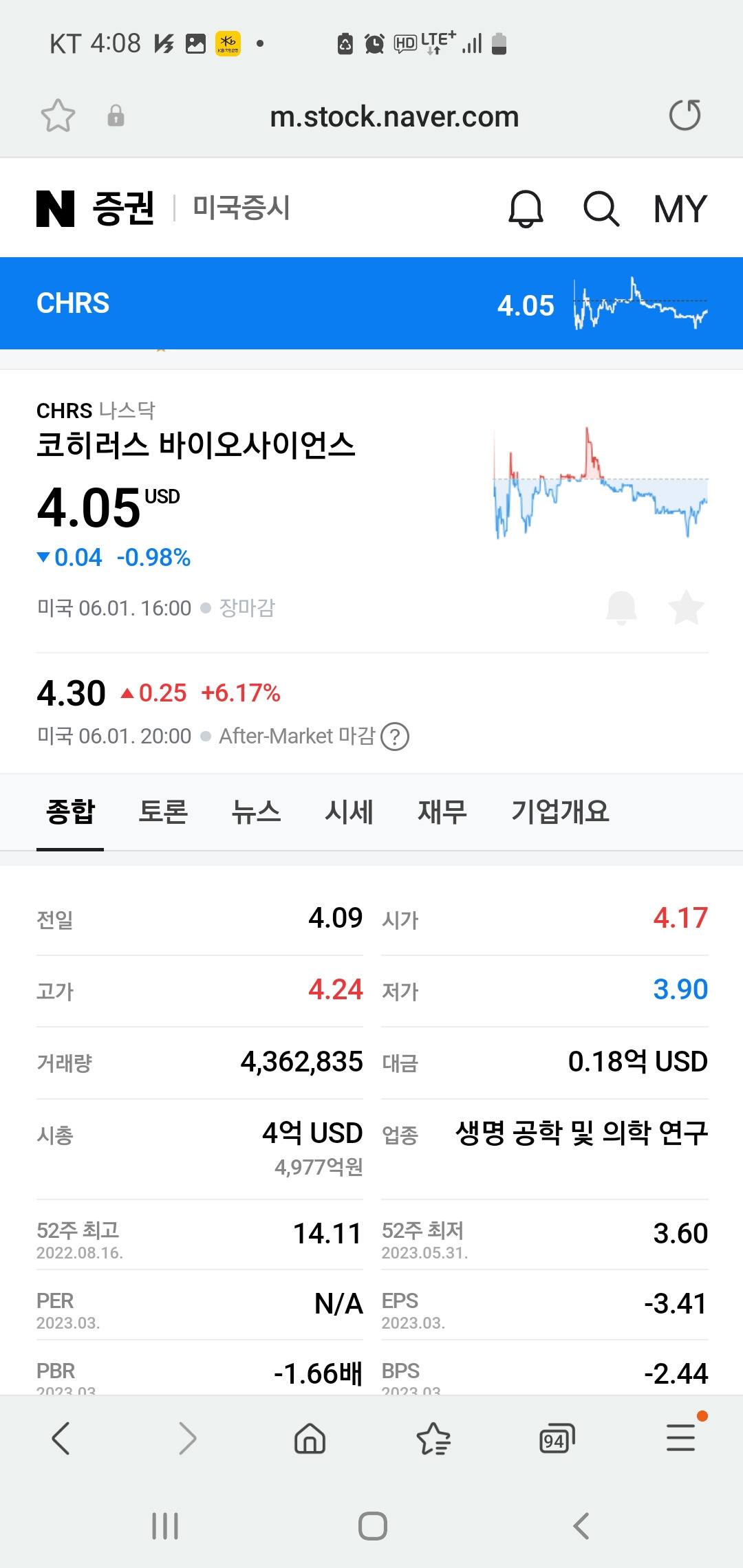 현재 코히러스 바이오사이언스의 주가는 4.05 USD로 나타나고 있어요. 최근 주가는 -0.04 USD(-0.98%) 하락했지만, 장마감 후에는 4.30 USD로 0.25 USD(+6.17%) 상승했어요. 오늘 하루 동안의 거래량은 4,362,835주로, 시가총액은 약 4천만 달러에 달해요.