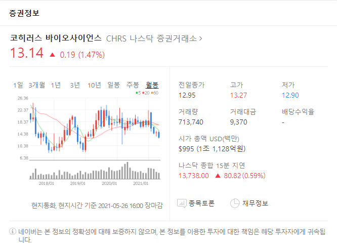 [2] 한국경제 - 코히러스 바이오사이언시스 - CHRS (https://www.hankyung.com/globalmarket/equities/americas/chrs)