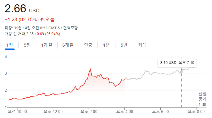 또한, 현재 QUBT의 주가는 2.66 USD로, 오늘 하루에만 92.75% 상승했어요.