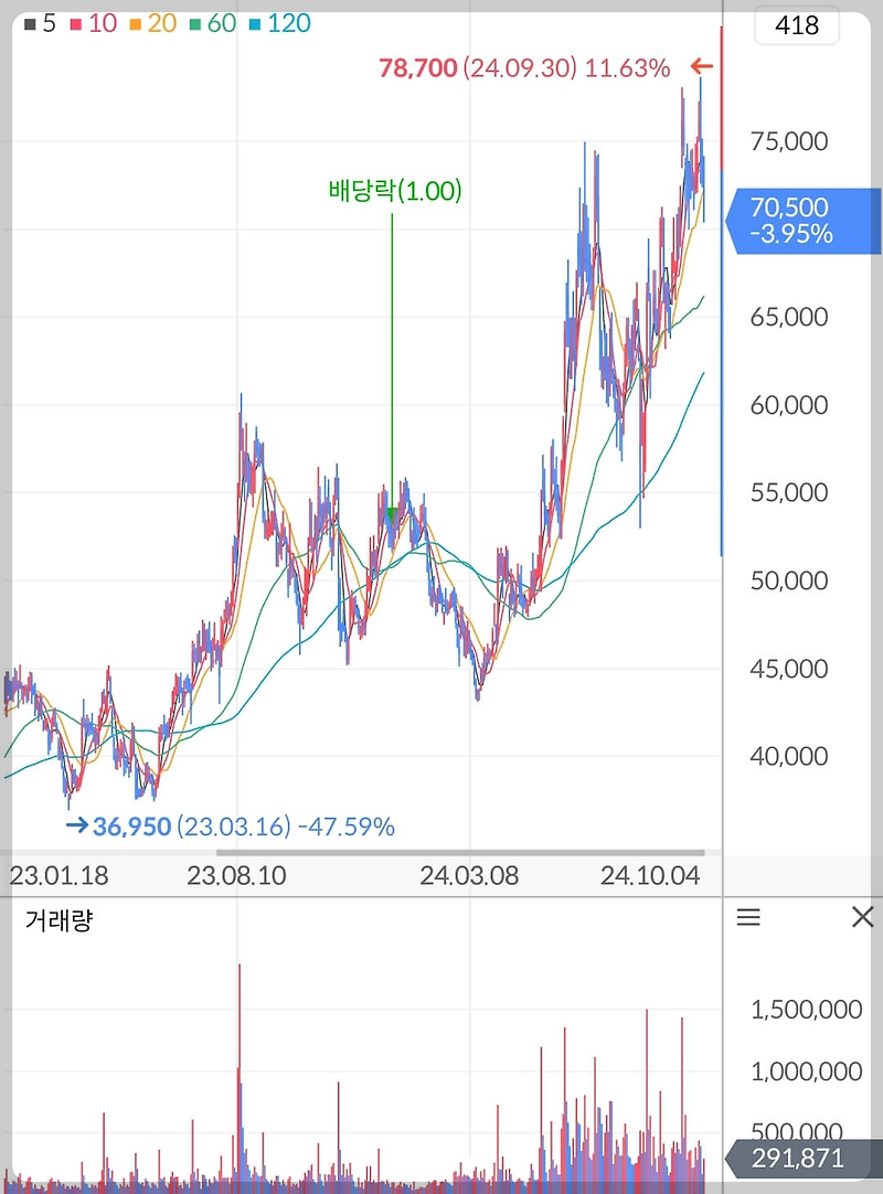 주가 차트에서 가장 높은 가격은 75,000원이었고, 현재 주가는 70,500원으로, 3.95% 하락했어요. 이러한 변동성은 시장의 다양한 요인에 의해 영향을 받고 있죠.
