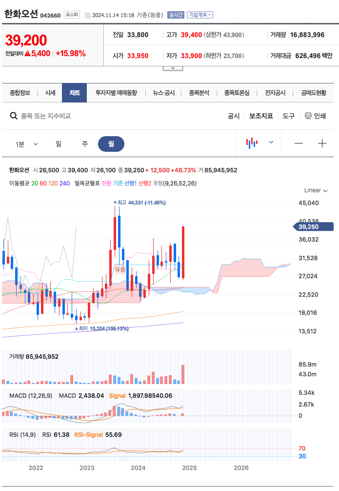 한화오션은 현재 매우 긍정적인 주가 흐름을 보이고 있으며, 업계 전반의 회복세와 함께 향후에도 좋은 성과를 기대할 수 있을 것 같아요. 지속적인 기술 개발과 계약 체결이 이루어진다면 더욱 안정적인 성장세를 유지할 것으로 보이네요. 다만, 투자 시에는 항상 리스크를 고려해야 하니 신중하게 접근하는 것이 좋겠어요.