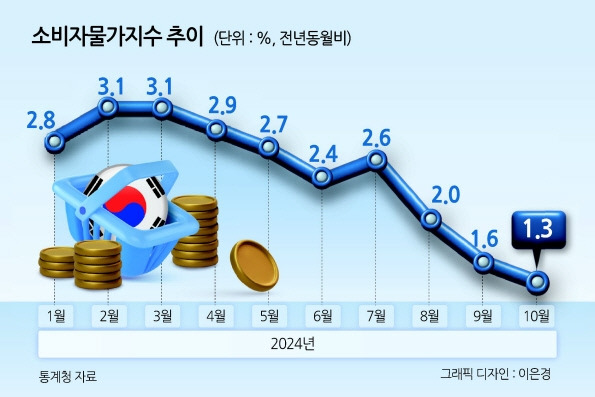[2] 조선일보 - 10월 소비자 물가 상승률 1.3%... 두달째 1%대 (https://www.chosun.com/economy/economy_general/2024/11/05/OY6UPND6XVDTNIXJWNRNLBTOEI/)